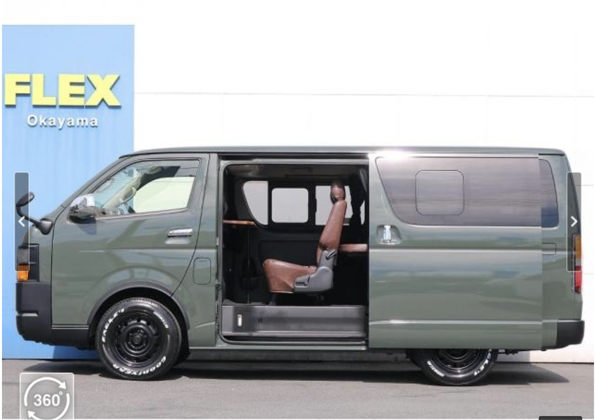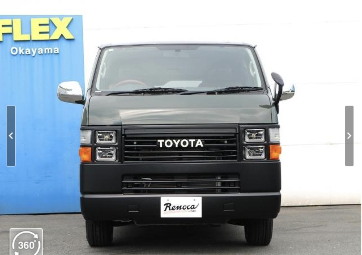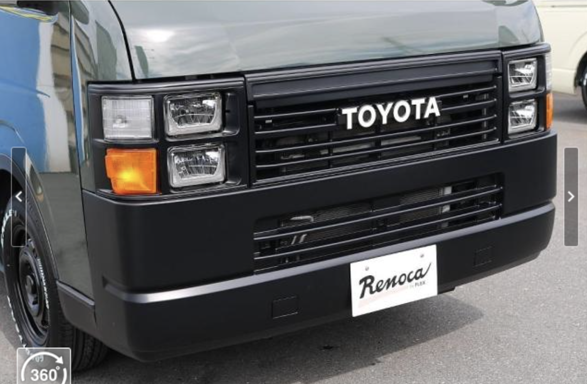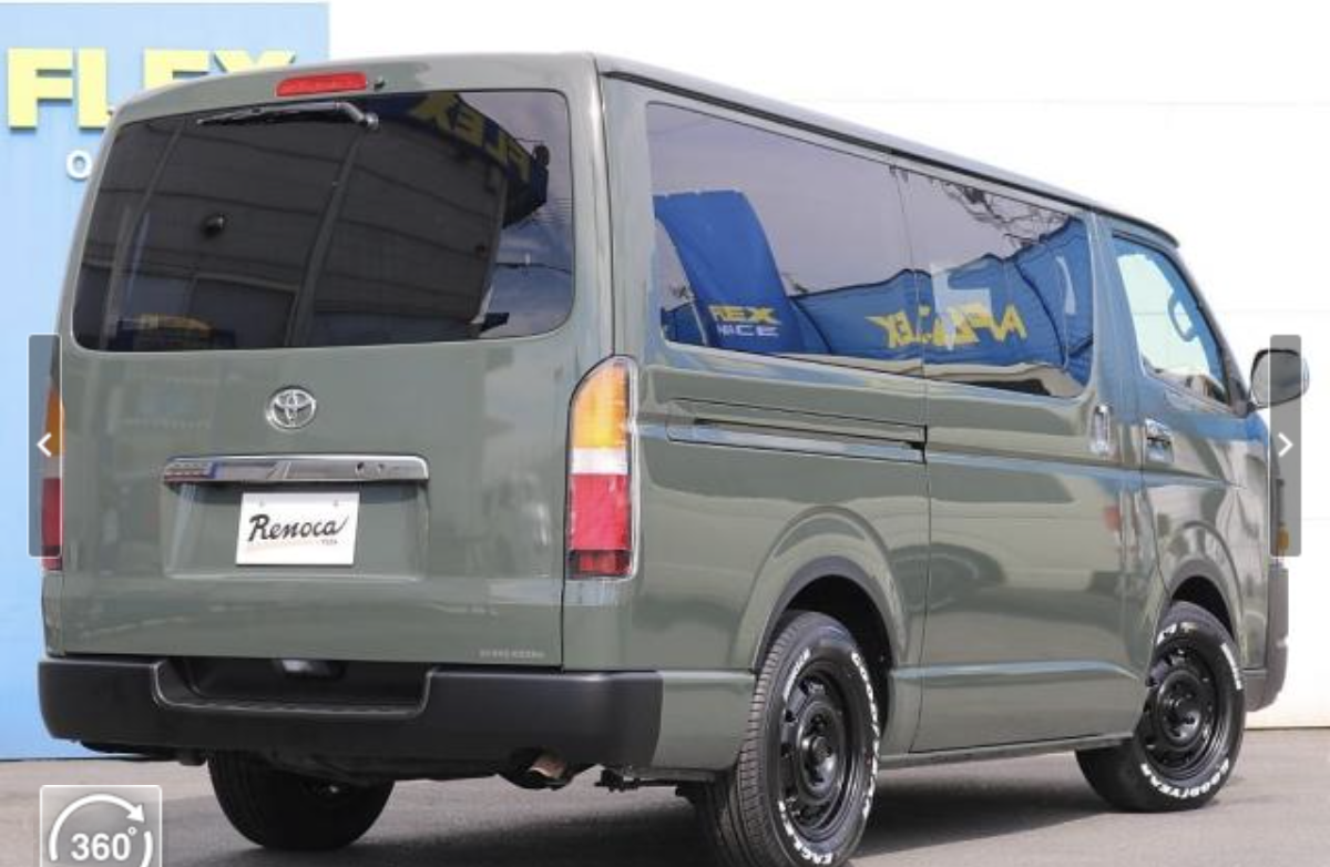 This is a 2017 (H29) Toyota HiAce Van (200-series) in the Super GL Dark Prime trim, which has been converted by FLEX Auto into their "Renoca CoastLines" specification — a retro-styled restomod featuring square (角目 / kaku-me) headlights that give the 200-series HiAce an old-school look reminiscent of the classic 60- and 70-series models. The exterior is finished in Black Mica (ブラックマイカ) and the colour package is called "Keswick Green" on the Renoca trim, with custom LED tail lamps fitted. Key Specs Engine: 2.0L petrol (2000cc), naturally aspirated, no turbo Drivetrain: 2WD, column/dash-mounted automatic (InpaneAT) Doors: 5D with dual sliding doors (both sides) Seating: 5 occupants Odometer: 94,000 km Steering: Right-hand drive Accident/repair history: None (修復歴なし) Chassis number (last 3): 377 Third-party inspection (Goo Kantei): Completed — rated 4/5 exterior, 4/5 interior, mechanicals clear Equipment Highlights (fitted) Dual airbags (driver/passenger), ABS, air conditioning plus rear air-con (W Air-Con), power steering, power windows, power folding mirrors, keyless entry, smart key, LED headlamps, back camera, ETC unit, 7-inch SD memory navigation with full-seg digital TV, alloy wheels, full curtains throughout, aftermarket seat covers, bed kit (for sleeping/cargo), and LED tail lamps. The Renoca conversion includes a custom centre console with armrest, drink holders, phone stand, and storage compartments.