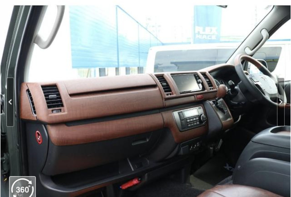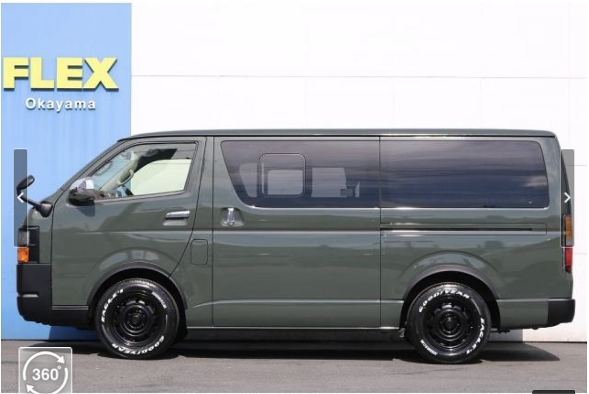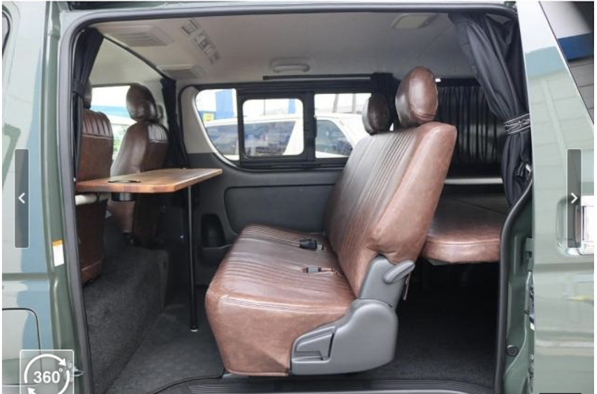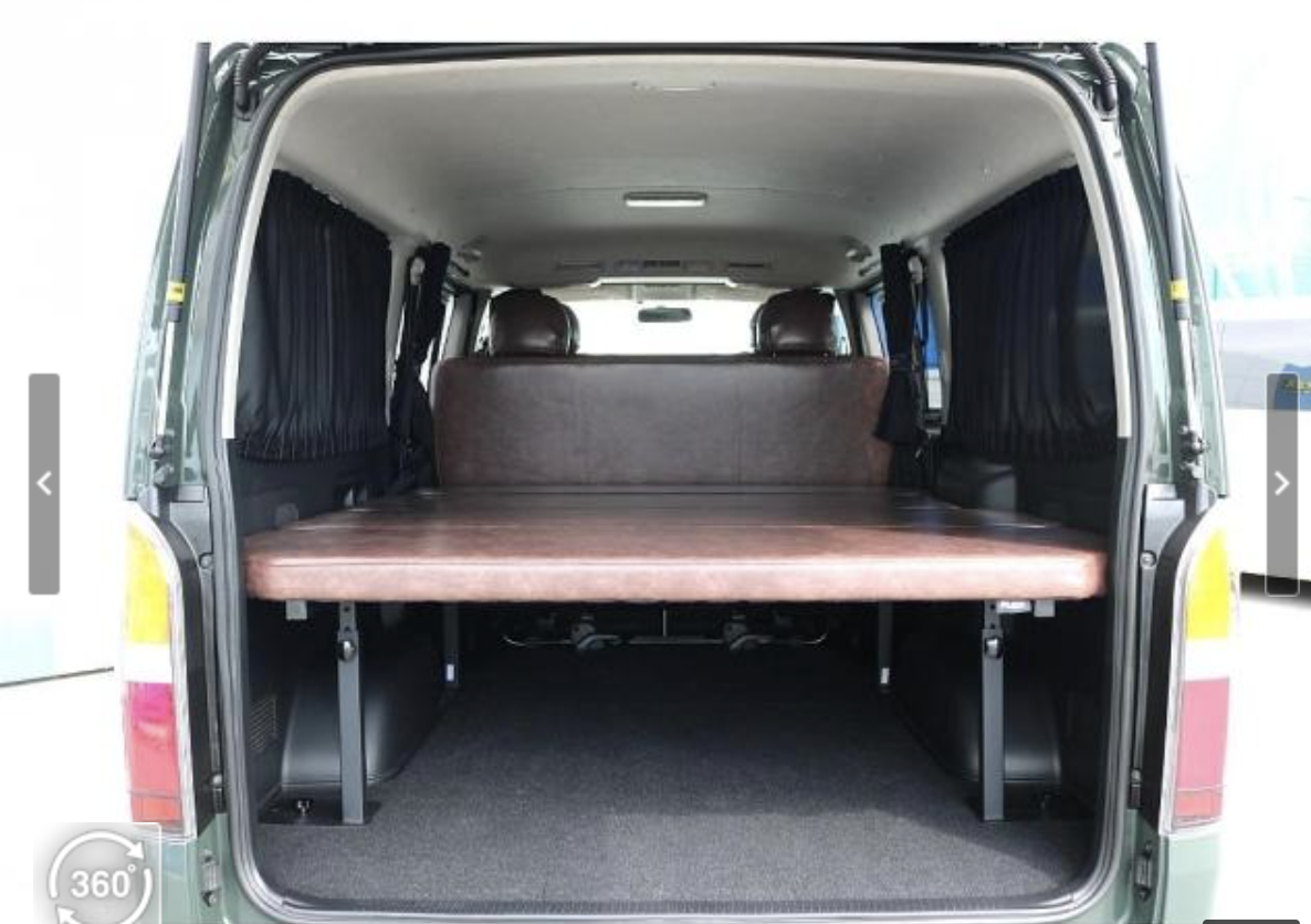 This is a 2017 (H29) Toyota HiAce Van (200-series) in the Super GL Dark Prime trim, which has been converted by FLEX Auto into their "Renoca CoastLines" specification — a retro-styled restomod featuring square (角目 / kaku-me) headlights that give the 200-series HiAce an old-school look reminiscent of the classic 60- and 70-series models. The exterior is finished in Black Mica (ブラックマイカ) and the colour package is called "Keswick Green" on the Renoca trim, with custom LED tail lamps fitted. Key Specs Engine: 2.0L petrol (2000cc), naturally aspirated, no turbo Drivetrain: 2WD, column/dash-mounted automatic (InpaneAT) Doors: 5D with dual sliding doors (both sides) Seating: 5 occupants Odometer: 94,000 km Steering: Right-hand drive Accident/repair history: None (修復歴なし) Chassis number (last 3): 377 Third-party inspection (Goo Kantei): Completed — rated 4/5 exterior, 4/5 interior, mechanicals clear Equipment Highlights (fitted) Dual airbags (driver/passenger), ABS, air conditioning plus rear air-con (W Air-Con), power steering, power windows, power folding mirrors, keyless entry, smart key, LED headlamps, back camera, ETC unit, 7-inch SD memory navigation with full-seg digital TV, alloy wheels, full curtains throughout, aftermarket seat covers, bed kit (for sleeping/cargo), and LED tail lamps. The Renoca conversion includes a custom centre console with armrest, drink holders, phone stand, and storage compartments.