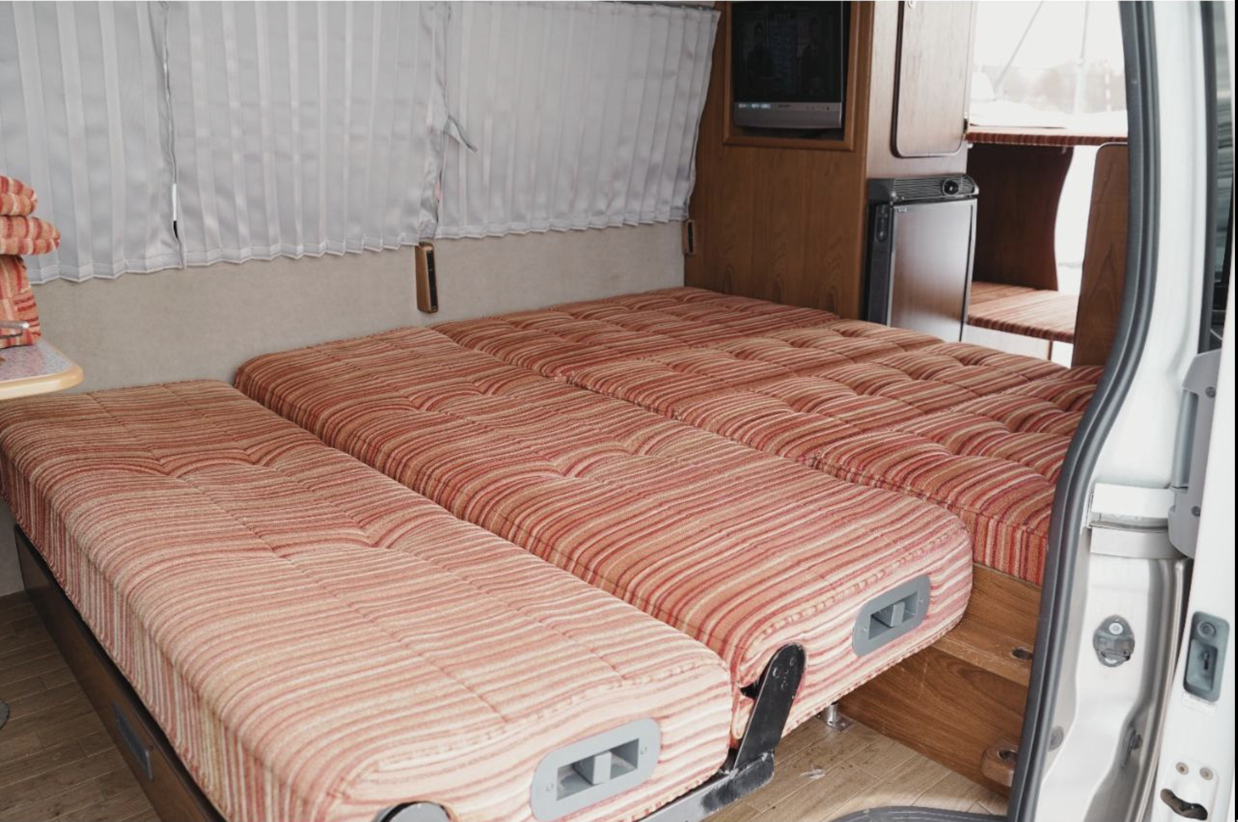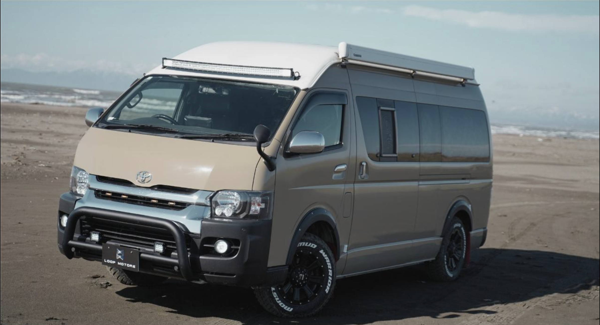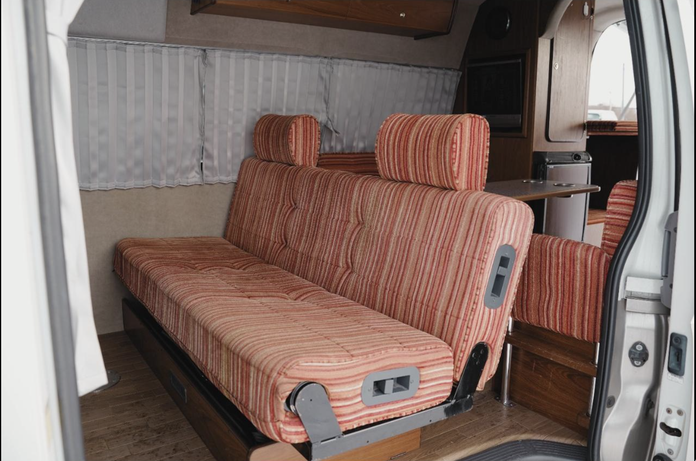 This Van has had a new exterior styling, complete with bull bar, LED light, wheel guards, wheel flats and a tow bar. Plus it sports a beautifully done two tone paint job. The campervan fit out includes a fasp seat, with seatbelts, it also flips into a flat bed. upright fridge and kitchen with a sink and an Awning.