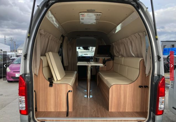 Camper converted van in Japan, clean 2 beds of a decent size, kitchen included and a sink. Bed looks like it can meet in the middle to make a double bed.